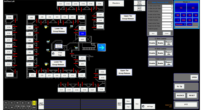 Sophisticated water control including, flush timers, number of cycles per hour, enable/disable from door control stations, utilizing the same above, off the shelf PLC systems, and fully integrated into a complete HMI solution.